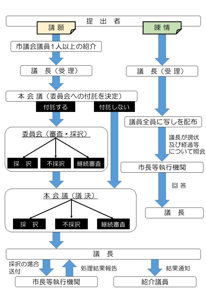 陳情とは、国または地方公共団体の機関に対し一定の事項について、その実情を訴え、適切な措置を願い出ることをいいます。請願とは異なり法律的な権利はなく、提出する際にも紹介議員は必要ありません。