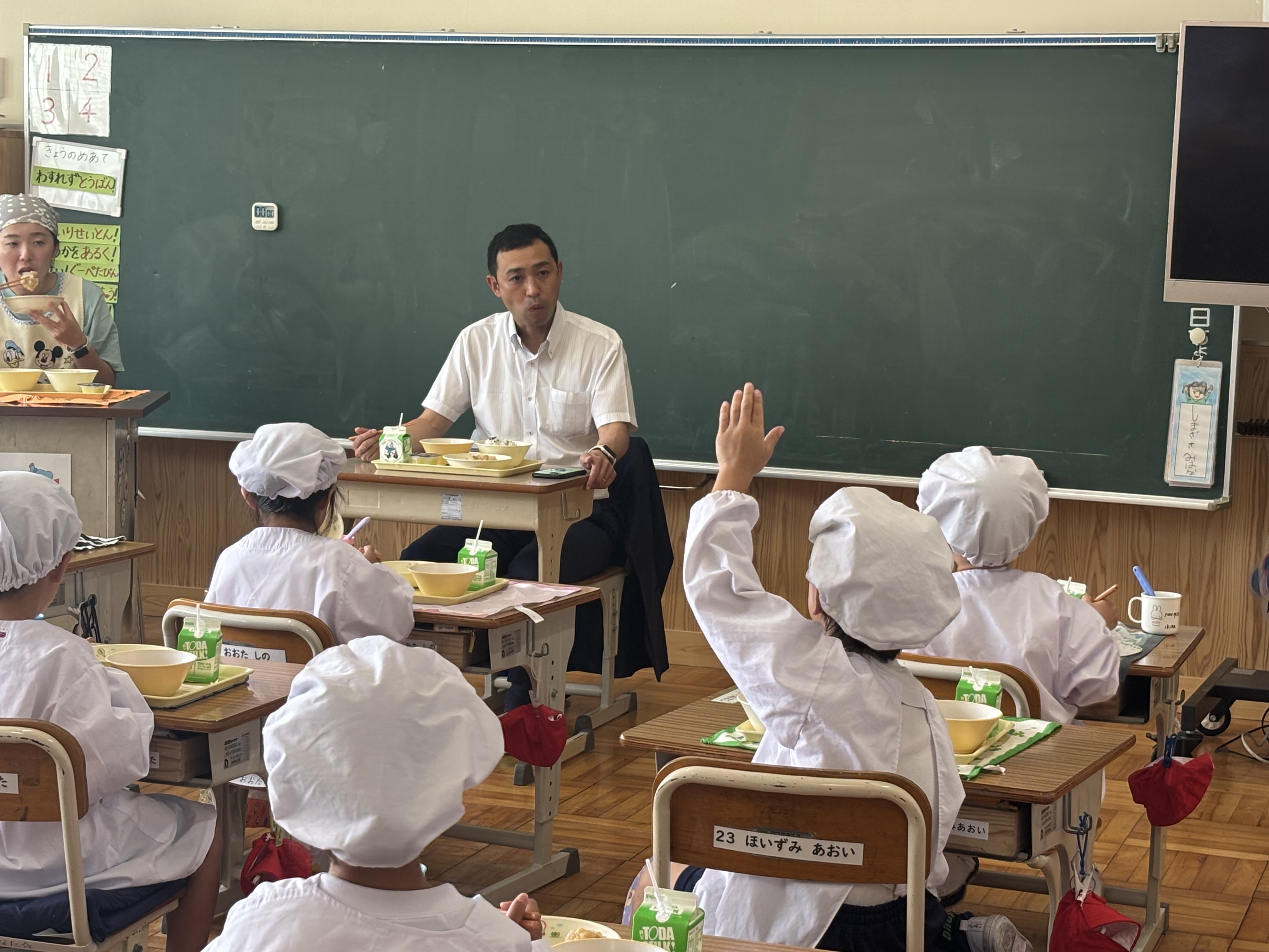 給食の時間中、児童たちからは「お名前は何ですか?」や「どんなお仕事をしていますか?」、「好きな色は何ですか?」など、たくさんの質問をいただきました。子どもたちの純粋な好奇心に触れ、元気をもらったひとときでした。